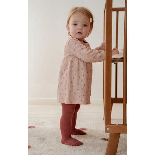 The intricate pointelle structure of the fabric, in a beautiful light shade of pink, is adorned with a charming print of petite flowers.