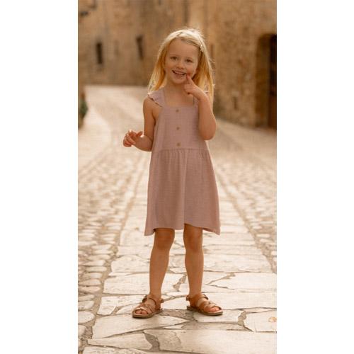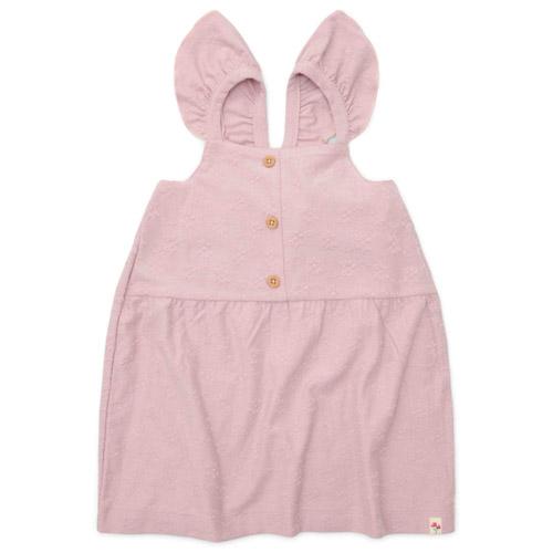 The whimsical ruffles on the shoulders add a touch of playful elegance, while the wood-look buttons bring a classic detail to the design. Crafted from a blend of organic cotton and viscose, this dress not only ensures comfort but also radiates a lovely lilac colour.
