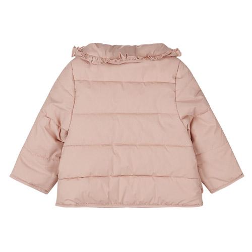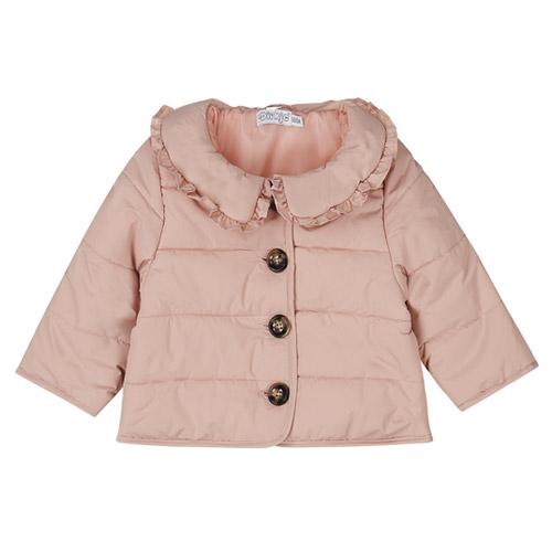 The soft pink color creates a cheerful look, while the ruffled collar adds a playful and trendy touch.