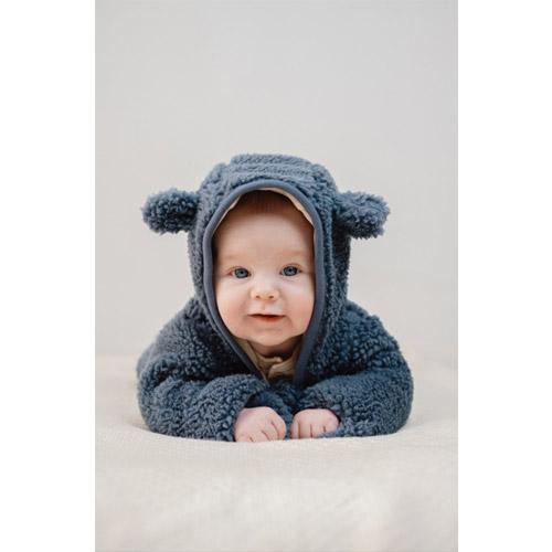 It is just as warm as it is comfortable and features a Stone Blue teddy fabric with cute ears on the hood.