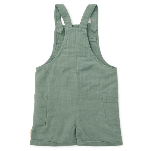 These linen-look dungarees feature a charming forest green striped pattern.