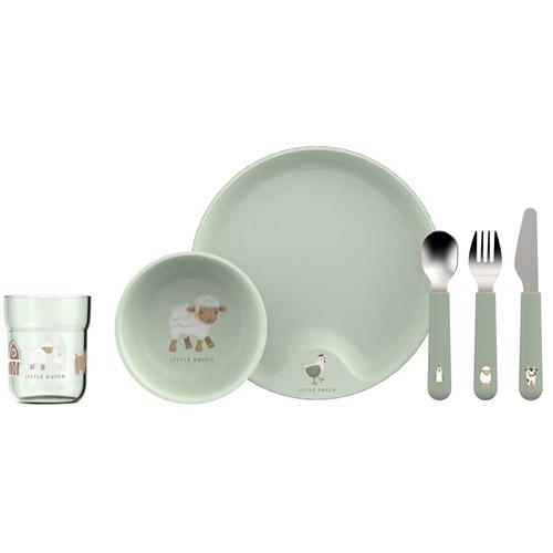 The set includes a cuterly set, a glass, bowls and a children's plate.