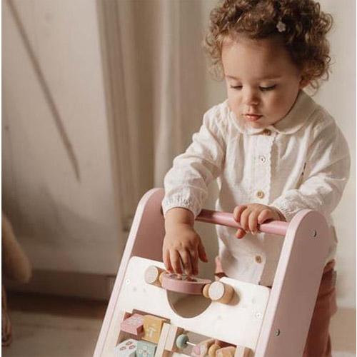 This wooden activity walker offers various challenging activities that support the development of your child's motor skills.