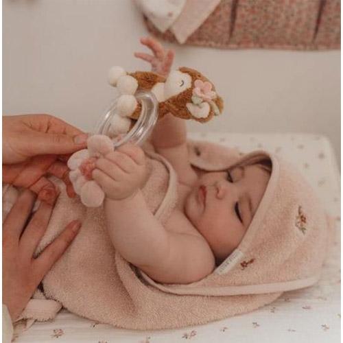 The sweet deer with her soft fur invites you to play and let this ring rattle ring ring. She has picked the little flower especially for you to cuddle.