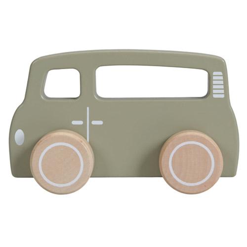 In a beautiful olive color, this Little Dutch bus drives around happily with its sturdy, wooden wheels.