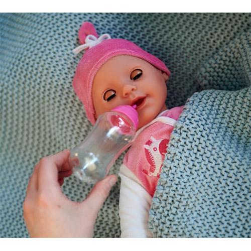 Ze heeft slaperige ogen, draagt een schattig rompertje met muts en kan 24 babygeluiden maken zoals "Mama", "Dada", "Hihi" en nog veel meer.
