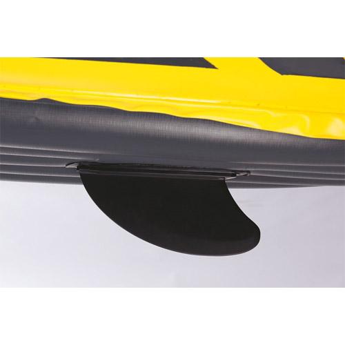 The Explorer K2 is the ideal rowing boat for rafting on the sea or river. It features a gray-yellow finish with a rubber protective skirt, two inflatable benches, oars, and a high-output inflation pump included.