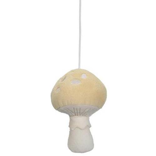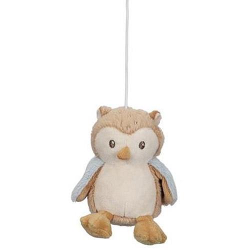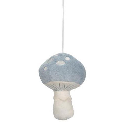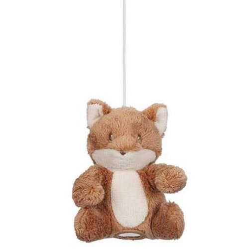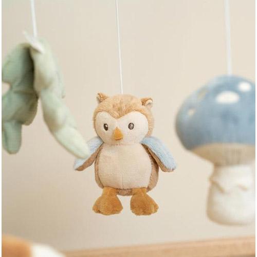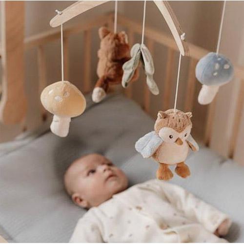 Le mobile présente cinq jouets de la collection Forest Friends : un renard, deux champignons, un hibou et une feuille.