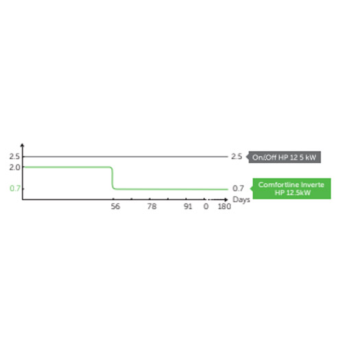 Le Comfortline Inverter fonctionne à basse vitesse pour économiser l'énergie avec un COP plus élevé que la moyenne du marché (indice d'efficacité).