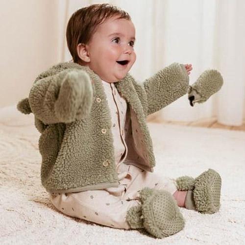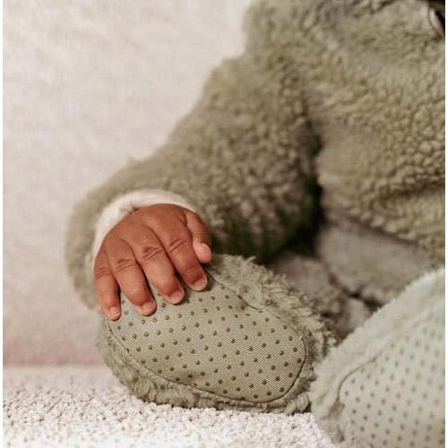 Fabriqués dans une matière douce et chaude en peluche de couleur vert tendre, ils sont doublés de coton biologique avec un imprimé ludique de petites feuilles à l'intérieur.