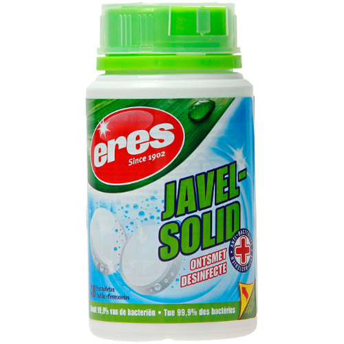 Pastilles Javel : désinfecte, nettoie, assainit et désodorise sols, carrelage, wc, poubelles et surfaces dans la cuisine et dans la salle de bains.