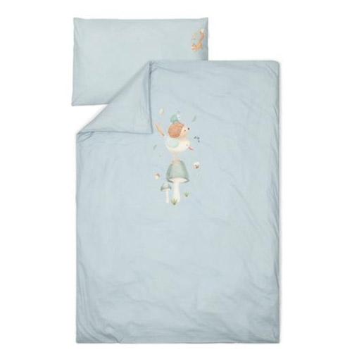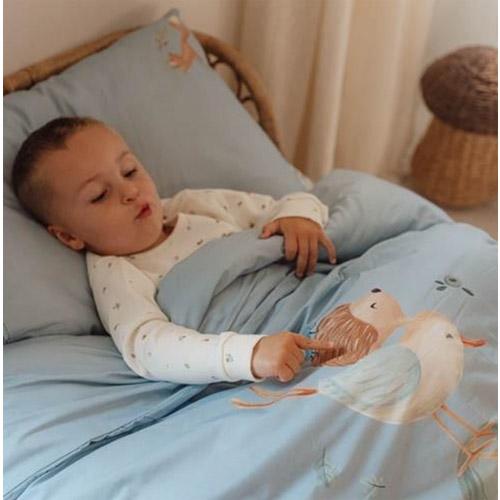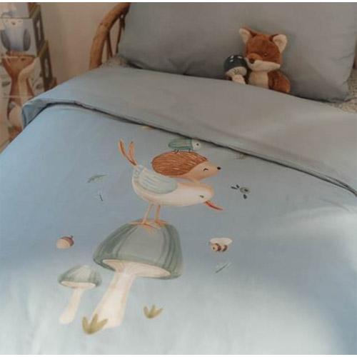 La housse de couette douce est composée à 100 % de coton biologique dans une couleur bleu denim uni décorée d'une scène ludique de la forêt.