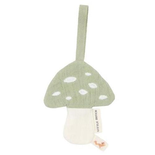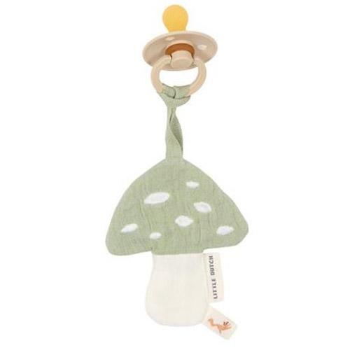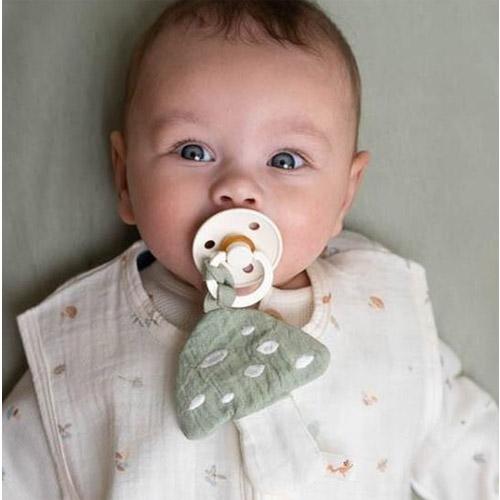 Le tissu a la forme d'un champignon, vert avec des points blancs, et la boucle pratique vous permet d'attacher facilement la tétine pour qu'elle soit toujours à portée de main dans les moments où votre petit en a le plus besoin.