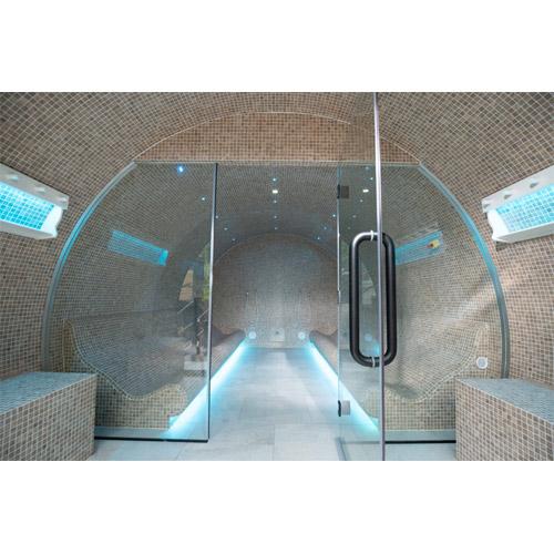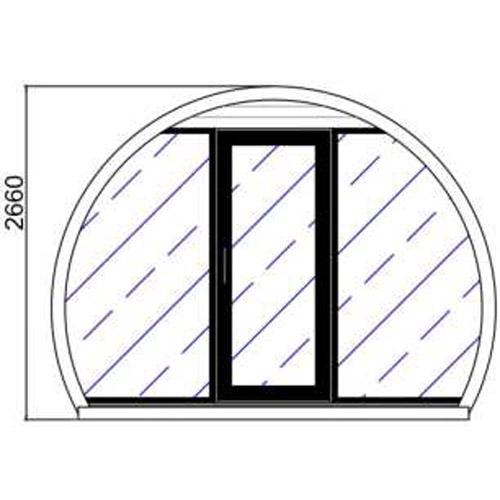 Glazen voorwand in dubbel isolerend helder gehard glas in aluminium kader.