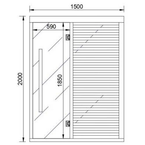 -Glazen voorwand en zijkant in helder gehard glas 8 mm dik, inclusief deur 1850 mm x 590 mm x 8 mm, handvat inox buiten en hout binnen.