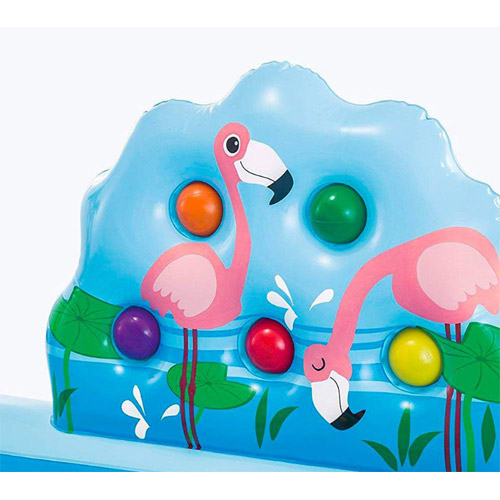 Dit zwembad is voorzien van een glijbaan, opblaasbare palmbomen, flamingo, aapje, ringenspel en vijf ballen om in de wand aan te brengen.