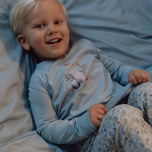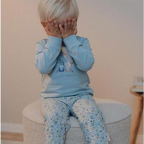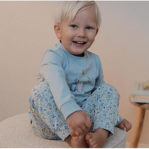 De lichtblauwe broek heeft een charmante print van blaadjes, uiltjes en andere vondsten uit het bos en het effen lichtblauwe shirt is versierd met een uil en zijn eekhoornvriendje.