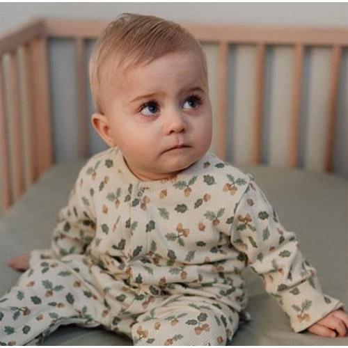 Deze onesie is gemaakt van comfortabel rib materiaal en heeft een charmante print van eikeltjes en blaadjes, perfect voor kleine natuurliefhebbers.