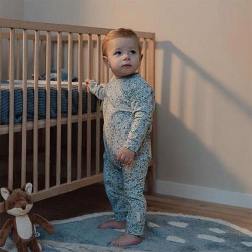 Gemaakt van comfortabel biologisch katoen, heeft het een lichtblauwe kleur met een schattige print van blaadjes, uiltjes en nog veel meer bosvondsten.