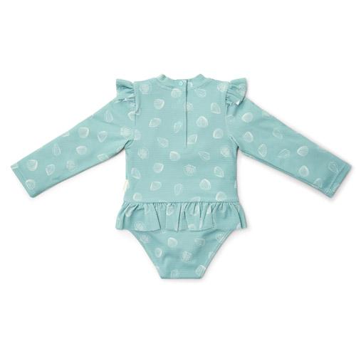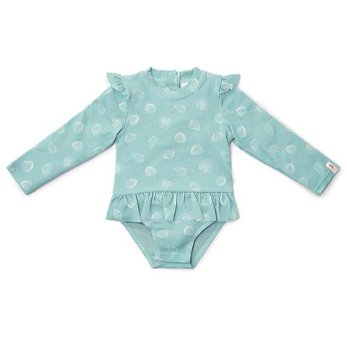 Dit schattige badpak met lange mouwen heeft een mooie mint groene basis versierd met een charmante print van witte schelpen, waardoor een fantasierijke look ontstaat.