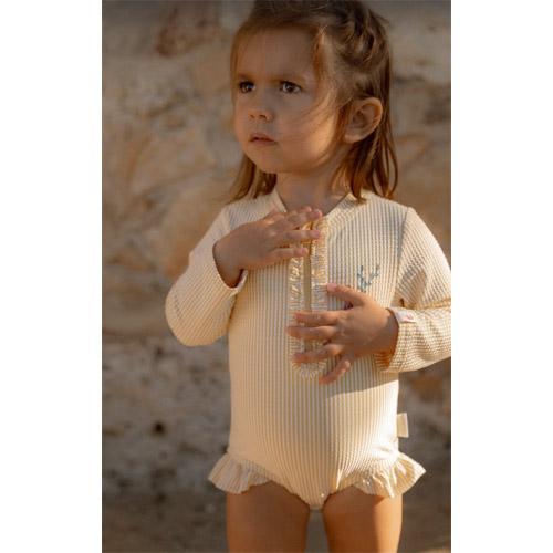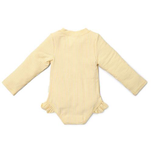 Dit badpak met lange mouwen heeft een fijn dessin van gele en witte streepjes versierd met een schattig roze zeepaardje als detail.