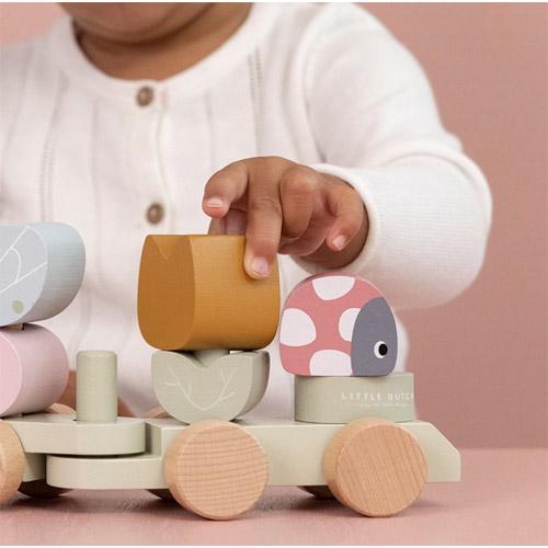 Gebruik je fantasie om de trein te bouwen met behulp van de stapelblokken in verschillende vormen en dromerige kleuren.