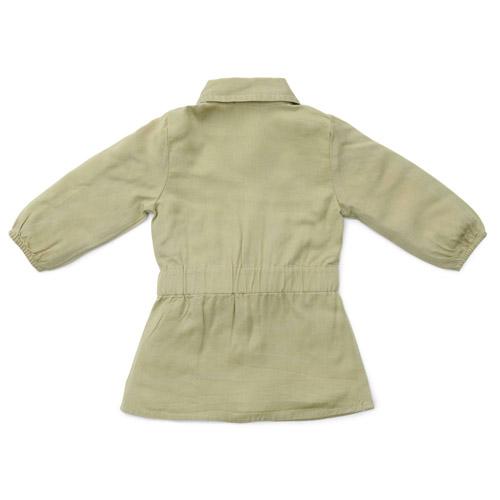 De jurk is voorzien van houtlook knopen aan de voorkant, elastische mouwuiteinden en een elastische tailleband met bijpassend riempje.