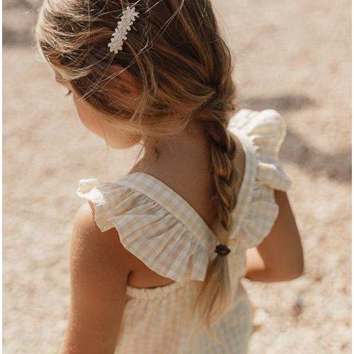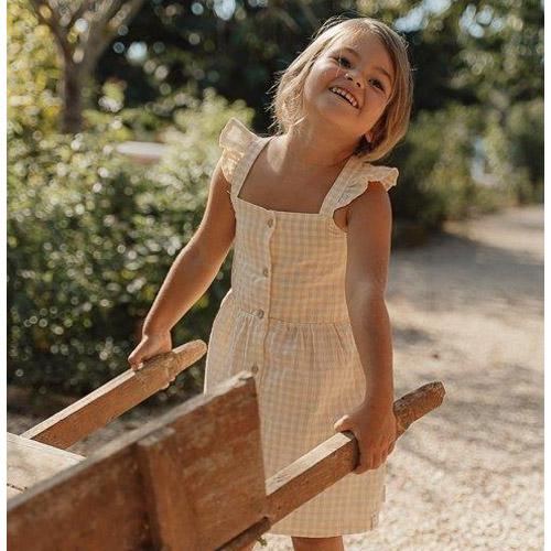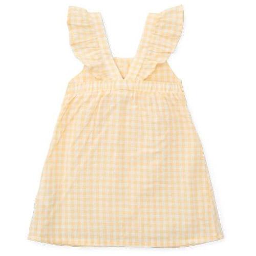 Het heeft een zomers geel met wit ruitjes dessin, ruches aan de schouderbandjes, fijne houtlook knoopjes en een elastische taille voor een mooie fit.