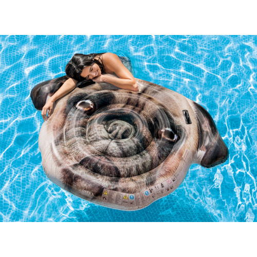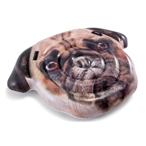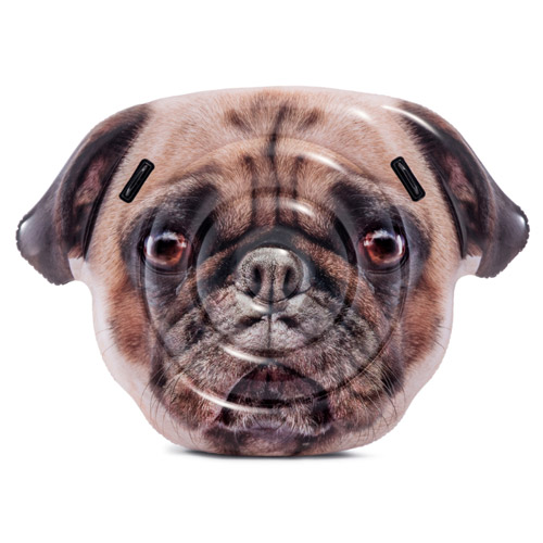 Mopshond gezicht eiland.Realistische gezicht van een mopshond afgeprint op de luchtmatras, voorzien van twee handvaten.Afmetingen: 173 cm x 130 cm.Vinyl.