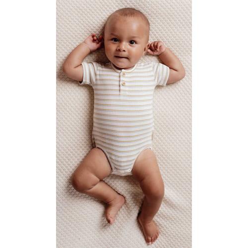 Gemaakt van zacht biologisch katoen met een fijne geribbelde textuur, biedt het een nauwsluitende maar flexibele pasvorm, perfect voor de dagelijkse avonturen van je baby.