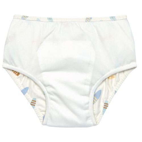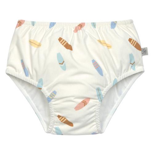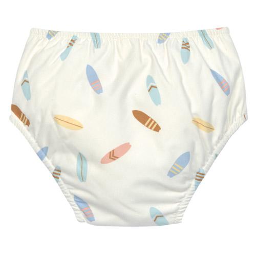 De witte babyzwemluier met surfplankprint biedt een mooi en milieuvriendelijk alternatief voor wegwerpluiers.