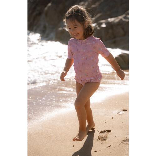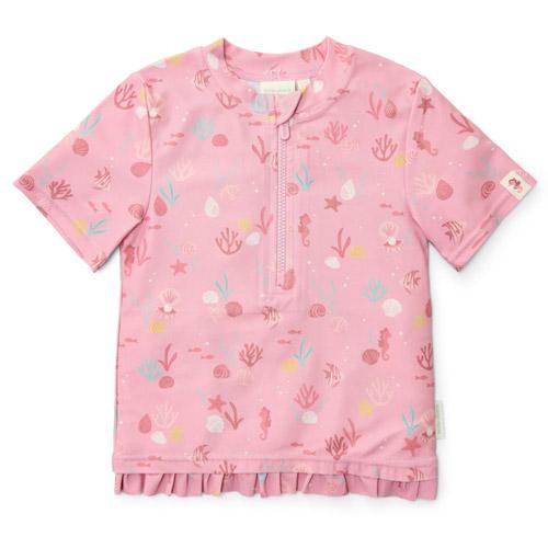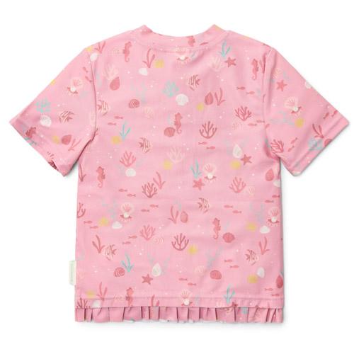 Dit schattige zwemshirt heeft een heerlijke lichtroze kleur versierd met zeepaardjes, koraal en schelpen, waardoor een prachtig onderwaterthema ontstaat.