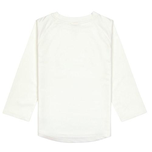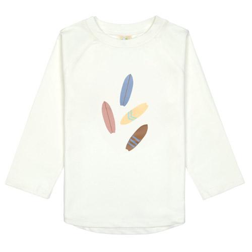 Het witte, lange mouwen UV-shirt voor kinderen met UV-bescherming 60, heeft een surfplankprint en is gemaakt van extra zachte stof.