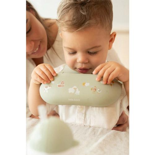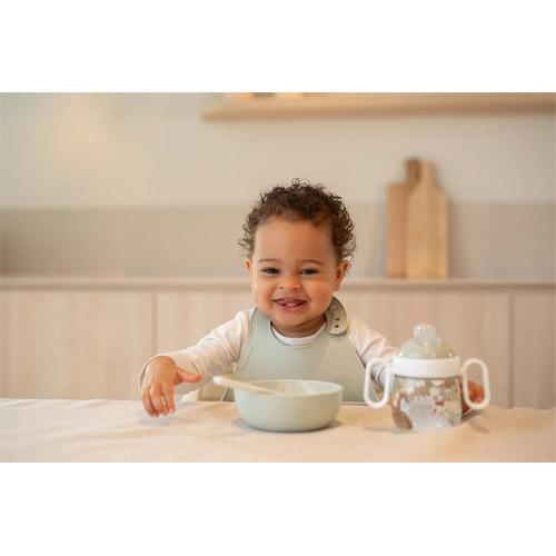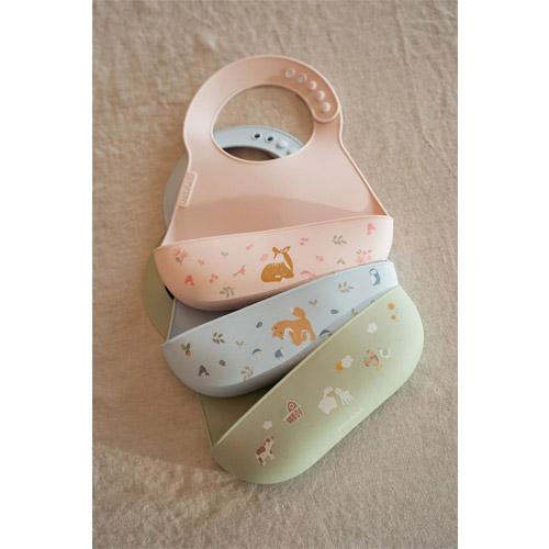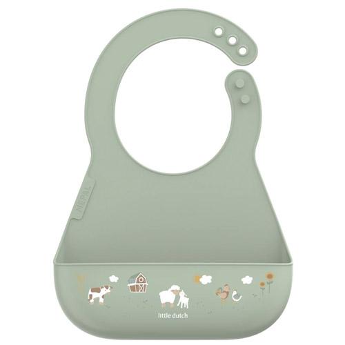 De Mepal Mio slab met het vrolijke Little Farm printje van Little Dutch beschermt kleertjes tijden de maaltijd en helpt je kindje bij het oefenen met zelf eten.