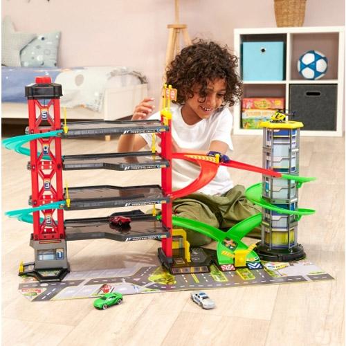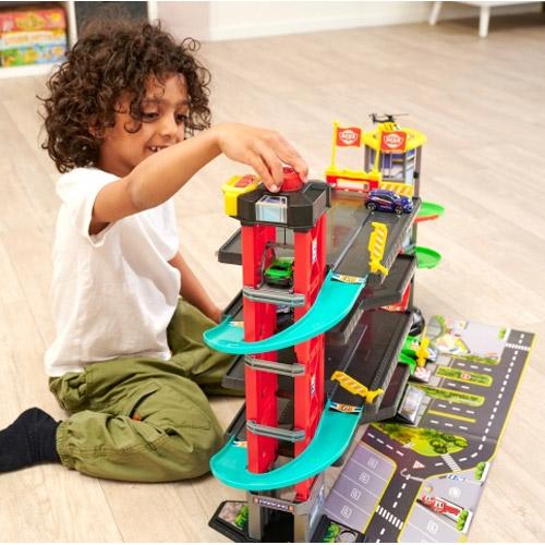 Grote garage met 5 verdiepingen met lift, racebaan, speelgoedauto's, helikopter, geluid en licht.