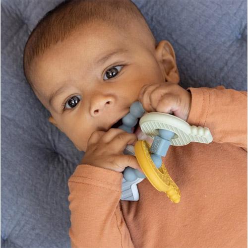 Om de pijn te verlichten heeft Little Dutch een multifunctionele bijtring ontworpen in de vorm van een sleutelbos.