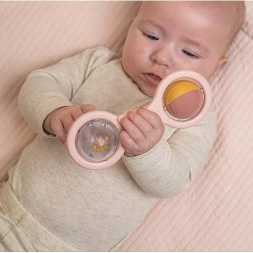 De rammelaar heeft een handvat waardoor je kindje deze goed vast kan houden en er met veel plezier mee kan spelen.