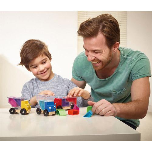 In de doos : - 3 houten vrachtwagens met doorzichtige laadbakken.