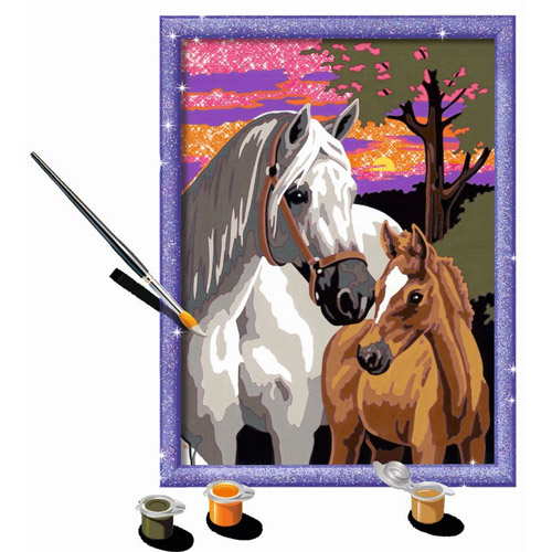 Schilder als een echt kunstenaar in wording met Ravensburger schilderen op nummer paarden in zonsondergang set.