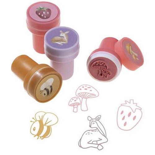 Deze stempelset bevat 16 verschillende stempels, waaronder schattige hertjes, eekhoorntjes en lieveheersbeestjes, maar ook een aardbei, bloemen en een bij.