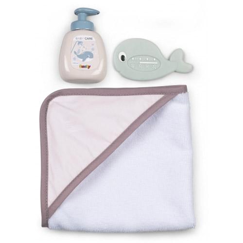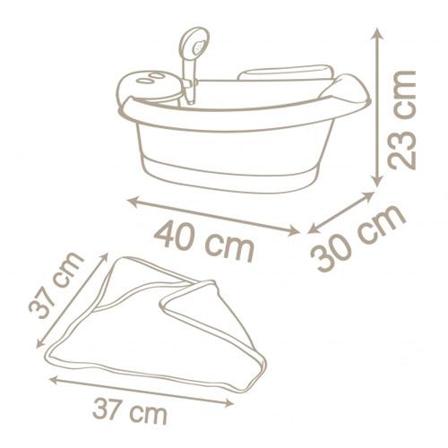 Een opbergbak, een hoofdsteun, een functionele handdouche en er worden verschillende accessoires meegeleverd om de speelfuncties te verbeteren: badcape sponsmateriaal, douchegel foam pusher met mechanische actie, thermometer warmtegevoelige walvis.